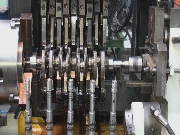 3.滾壓四缸機曲軸:滑臺橫向進給,九個夾鉗油缸通過滾壓頭分別夾緊工件上各自對應(yīng)的主軸頸和連桿頸,此時潤滑油開。滾壓時九個夾鉗油缸按預(yù)定壓力進行加卸載,按設(shè)定滾壓圈數(shù)完成滾壓。滾壓完成后滾壓裝置退出。